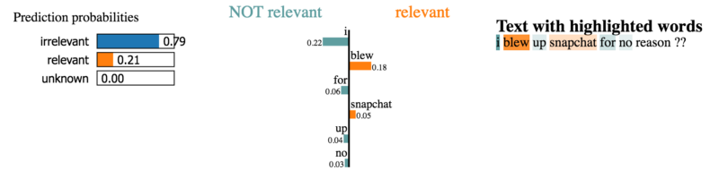 We split our data in to a training set used to fit our model and a test set to see how well it generalizes to unseen data. After training, we get an accuracy of 75.4%. Not too shabby! Guessing the most frequent class (âirrelevantâ) would give us only 57%. However, even if 75% precision was good enough for our needs, we should never ship a model without trying to understand it.