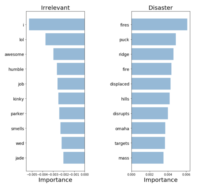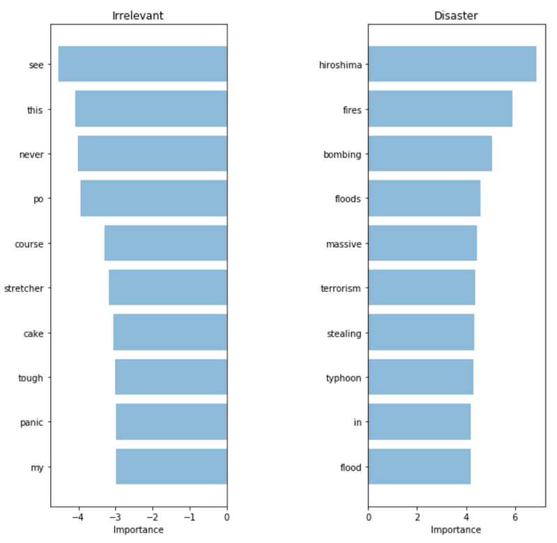 To validate our model and interpret its predictions, it is important to look at which words it is using to make decisions. If our data is biased, our classifier will make accurate predictions in the sample data, but the model would not generalize well in the real world. Here we plot the most important words for both the disaster and irrelevant class. Plotting word importance is simple with Bag of Words and Logistic Regression, since we can just extract and rank the coefficients that the model used for its predictions.