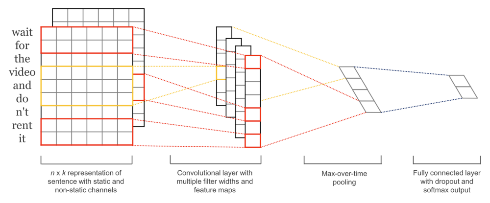 Convolutional Neural Networks for Sentence Classification train very quickly and work well as an entry level deep learning architecture. While Convolutional Neural Networks (CNN) are mainly known for their performance on image data, they have been providing excellent results on text related tasks, and are usually much quicker to train than most complex NLP approaches (e.g. LSTMs and Encoder/Decoder architectures). This model preserves the order of words and learns valuable information on which sequences of words are predictive of our target classes. Contrary to previous models, it can tell the difference between âAlex eats plantsâ and âPlants eat Alex.â