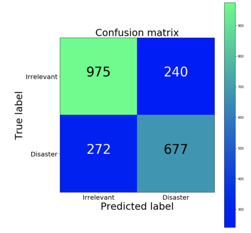 A first step is to understand the types of errors our model makes, and which kind of errors are least desirable. In our example, false positives are classifying an irrelevant tweet as a disaster, and false negatives are classifying a disaster as an irrelevant tweet. If the priority is to react to every potential event, we would want to lower our false negatives. If we are constrained in resources however, we might prioritize a lower false positive rate to reduce false alarms. A good way to visualize this information is using a Confusion Matrix, which compares the predictions our model makes with the true label. Ideally, the matrix would be a diagonal line from top left to bottom right (our predictions match the truth perfectly).